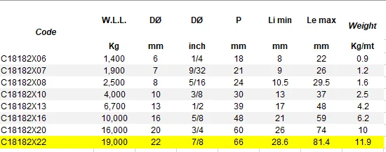 Αλυσίδα ανύψωσης Grade 100 με κωδικό προϊόντος C18182X σύμφωνα με τον Ευρωπαϊκό κανονισμό EN 818-2. Οι αλυσίδες είναι κατάλληλες για ανύψωση, έλξη, και πρόσδεση φορτίου. Οι αλυσίδες Grade 100 πρέπει να χρησιμοποιούνται με τα αντίστοιχα Grade 100 εξαρτήματα. Οι αλυσίδες Grade 100 έχουν συντελεστή ασφαλείας 4:1.